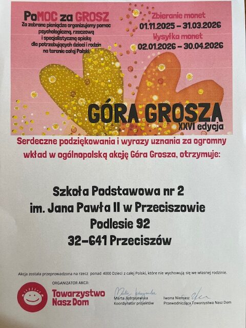 W naszej szkole po raz kolejny odbyła się akcja Góra Grosza, która pokazuje, jak wielką siłę ma wspólne działanie i drobne gesty. Przez kilka tygodni uczniowie, nauczyciele oraz pracownicy szkoły zbierali grosiki udowadniając, że nawet najmniejszy grosz może mieć ogromne znaczenie.