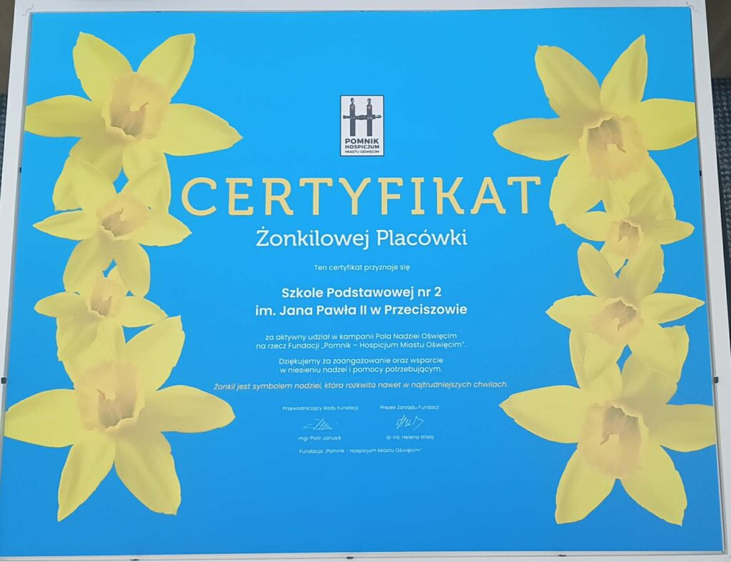 Nasza szkoła dołączyła do grona Żonkilowych placówek, włączając się w działania organizowane przez Fundację Pomnik – Hospicjum Miastu Oświęcim w ramach kampanii Pola Nadziei.