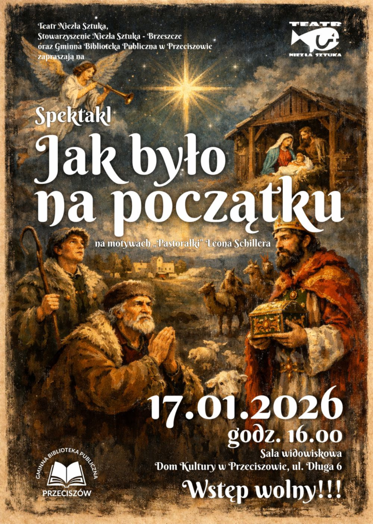 17 stycznia 2026 roku o godzinie 16.00 w sali widowiskowej Domu Kultury w Przeciszowie publiczność będzie miała okazję obejrzeć wyjątkowe widowisko teatralne – pastorałkę Leona Schillera „Jak było na początku” w wykonaniu teatru „Niezła Sztuka”, działającego przy Ośrodku Kultury w Brzeszczach. To wydarzenie wpisuje się w piękną tradycję prezentowania klasycznych tekstów polskiej kultury w nowym, scenicznym wydaniu, bliskim współczesnemu widzowi.